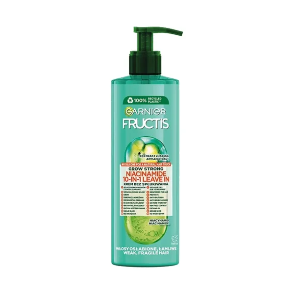 کرم مو ده کاره نیاسینامید گارنیه در حجم ۴۰۰ میل مانند دیگر مدلهای کرم مو گارنیر، ده ویژگی و خاصیت برای موهای آسیب دیده و خشک دارد. مشکلاتی مانند خشکی، ریزش مو، موخوره، وزی و غیره که همگی از آسیب مو سرچشمه میگیرند را این محصول درمان میکند. عصاره سیب، گلیسیرین گیاهی و نیاسین از ترکیبات تشکیل دهنده این محصول هستند. عصاره سیب خاصیت ضد ریزش دارد و خون رسانی را بهبود میبخشد. گلیسیرن هم خاصیت رطوبت رسانی داشته و رطوبت مورد نیاز مو را تامین میکند. نیاسین نیز علاوه بر خواص ذکر شده برای دو ترکیب بالا، رشد موها را تقویت نموده و ضخامت مو را نیز افزایش میدهد. خواص ده گانه کرم مو گارنیر نیاسینامید شامل موارد زیر میگردد: